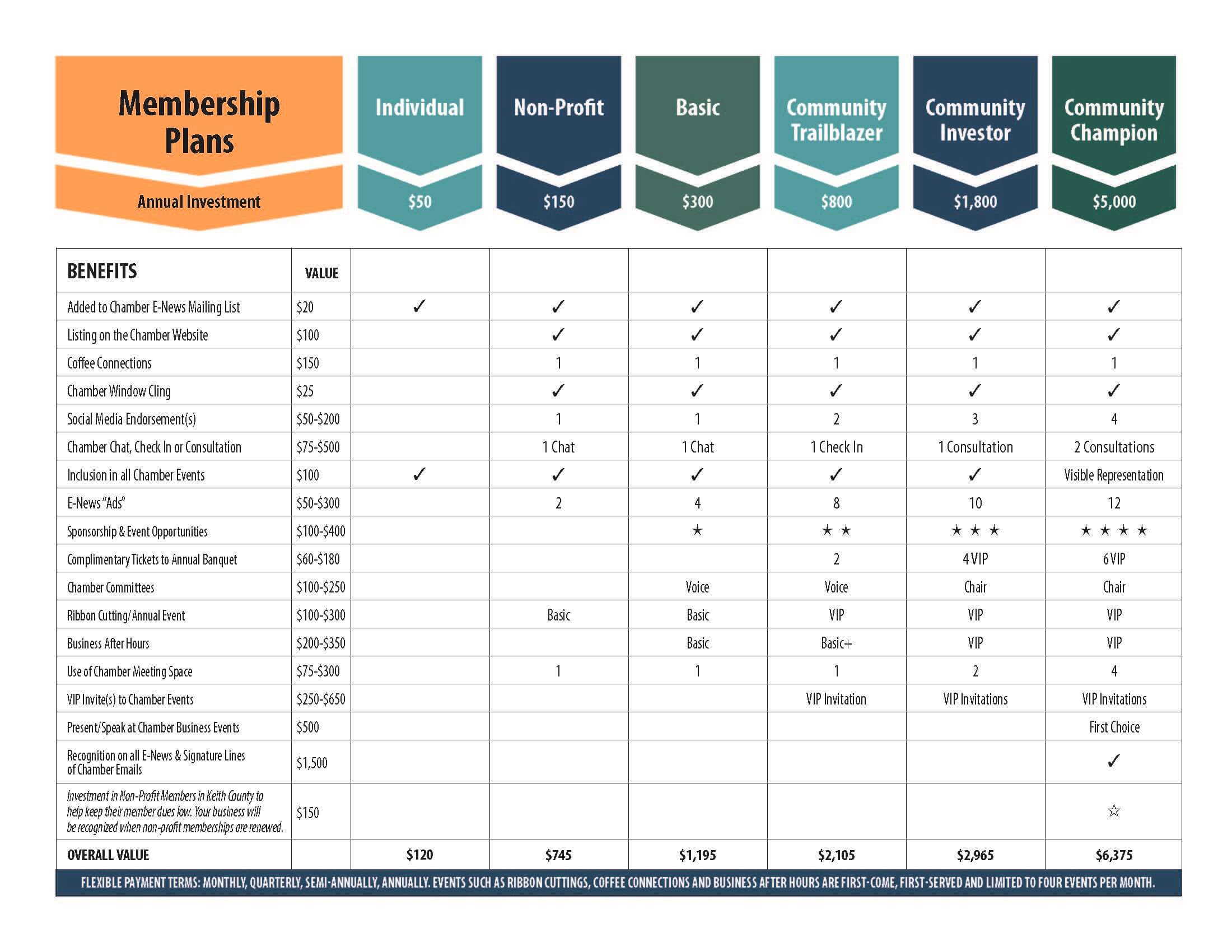 ”What do I get for my money?” This is on the mind of every business person. And that’s a good thing. We should all be concerned with value and making sure our investments are giving us a worthwhile return. Your Chamber investment is no exception. Welcome to Value Tiers--our tiered dues program that is designed to ensure that your investment is aligned with the value that you want and that will truly benefit your business. We will work with you to identify a benefit package that most closely meets your business needs—your investment will be linked to your level of involvement and the benefits you choose. Of course, we are happy to help you make the best choice for your business, so please call us to schedule a detailed presentation on the overall Value Tiers program at your convenience.
